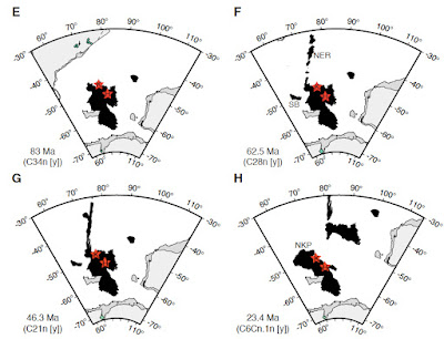 Plate reconstructions of the southern Indian Ocean region. Red stars = possible reconstructed positions of the Kerguelen Hotspot; those labeled “K” assume that the Kerguelen archipelago is the current location of the Kerguelen hotspot, and those labeled “H” assume that Heard Island is the hotspot’s current location. Black shading = magmatism associated with the Kerguelen Hotspot, diamonds = lamprophyres (labeled with “L” in 110 Ma panel) as they have appeared through geologic time. Dashed line = a possible northern boundary for Greater India. IND = India, ANT = Antarctica, AUS = Australia. (A), (B) Seafloor spreading initiated at ~133 Ma between Western Australia and Greater India and at ~125 Ma between Australia and Antarctica. This model assumes breakup between India and Antarctica at ~133 Ma, although the timing of this event is not well known. The Bunbury Basalt (BB) of Southwest Australia erupted close to these breakup events in both time and space. Continental portions of Elan Bank (EB) and the Southern Kerguelen Plateau (unknown dimensions) remained attached to Greater India at these times. The Naturaliste Plateau (NP) also contains continental crust. (C), (D) Seafloor spreading continued between India, Antarctica, and Australia. The initial massive pulse of Kerguelen magmatism created the Southern Kerguelen Plateau (SKP), the Rajmahal Traps (RAJ), and Indian/Antarctic lamprophyres (L) from ~120 to ~110 Ma (Fig. F3, p. 38) and may be linked to breakup and separation between Elan Bank and Greater India. The Central Kerguelen Plateau (CKP) formed between ~105 and ~100 Ma and Broken Ridge (BR) between ~100 and ~95 Ma (Fig. F3, p. 38). Igneous basement of the Wallaby Plateau (WP) is not well characterized geochemically and has not been dated, but its age is inferred to lie between ~120 and ~100 Ma. (E), (F) The hotspot generated the Ninetyeast Ridge (NER) and Skiff Bank (SB) as India continued its northward drift relative to Antarctica. (G), (H) At ~40 Ma, seafloor spreading commenced between the Central Kerguelen Plateau and Broken Ridge. The hotspot generated the Northern Kerguelen Plateau (NKP), and, since 40 Ma, as Broken Ridge and the Kerguelen Plateau have continued to separate, has produced the Kerguelen Archipelago, Heard and McDonald Islands, and the chain of volcanoes between Kerguelen and Heard. Frey et al. (2003).
